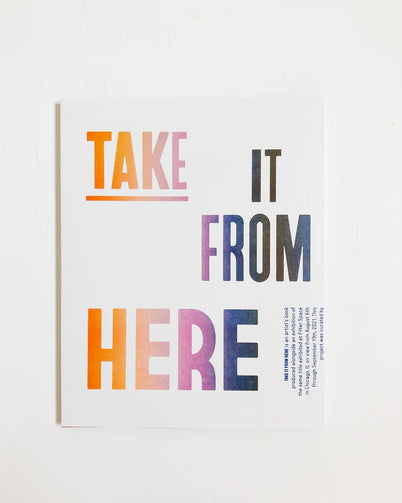 TAKE IT FROM HERE is an artist's book/exhibition catalog featuring artworks by ten emerging photographers who use the camera as a multifaceted site of imagination, play, and self-exploration. Considering photography’s sordid relationship with the politics of representation, the selected artists collectively highlight new freedoms and visual possibilities of self-expression alive within the medium.